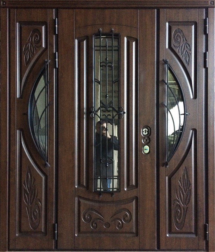 Металлическую дверь из корабельной фанеры можно декорировать ковкой и стеклом, витражом, зеркальными вставками. При установки такой двери в коттедж, стоит рассмотреть вариант изготовления двери с терморазрывом. Это позволит не делать в доме холодный тамбур, но при этом сохранить в доме тепло.