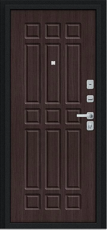 Надежная входная Дверь Браво Мило МФ/BChrome Букле черное/Букле черное/Wenge Melinga премиум класса по цене 31 399 руб. Большая толщина стали защитит от проникновения в ваш дом, квартиру или коттедж. Используется очень качественная фурнитура: замки, цилиндры, ручки, защелки. Покрытие и отделка двери изготовлено под внимательным контролем производителя. Дверь имеет долгий срок службы и гарантию.