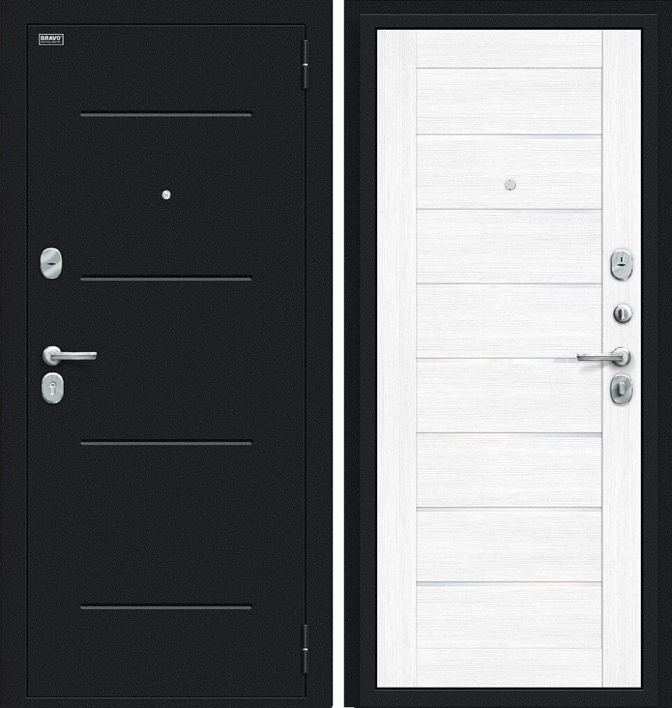 Надежная входная Дверь Браво Техно Букле черное/Snow Melinga премиум класса по цене 31 049 руб. Большая толщина стали защитит от проникновения в ваш дом, квартиру или коттедж. Используется очень качественная фурнитура: замки, цилиндры, ручки, защелки. Покрытие и отделка двери изготовлено под внимательным контролем производителя. Дверь имеет долгий срок службы и гарантию.